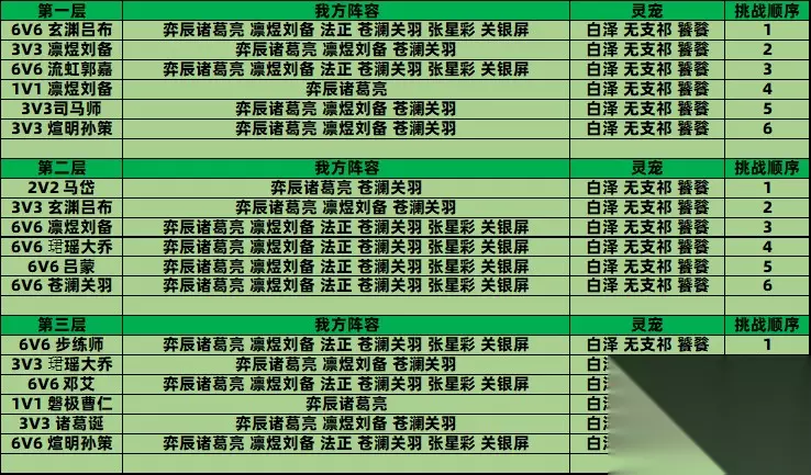 6V6推荐: 阵容一:吕玲绮(专武+五红)+重溟张飞(关羽羁绊)+孙尚香(专武+五红)+苍澜关羽(关平羁绊,放在后排)+凛煜刘备(赵云羁绊)+蔡文姬(专武+五红) 阵容二:孙尚香(专武+五红)+重溟张飞(关羽羁绊)+蔡文姬(专武+五红)+苍澜关羽(关平羁绊,放在后排)+凛煜刘备(赵云羁绊)+蒋钦 阵容三:弈辰诸葛亮(黄月英羁绊)+凛煜刘备(赵云羁绊)+法正(专武+五红)+苍澜关羽(关平羁绊,放在后排)+张星彩(专武+五红)+孙尚香(专武+五红) 双队阵容一: 第一队:煊明孙策(周瑜羁绊)+朱然+孙尚香(专武+五红)+苍澜关羽(关平羁绊,放后排)+珺瑶大乔(孙鲁育羁绊)+蒋钦 第二队:昭珩陆逊(凌统羁绊)+法正(专武+五命)+马良(专武)+弈辰诸葛亮(姜维羁绊)+凛煜刘备(赵云羁绊)+吕玲绮(专武+五命) 双队阵容二: 第一队:曹操(专武+五红)+磐极曹仁(曹植羁绊)+蔡文姬(专武+五红)+凛煜刘备(赵云羁绊)+法正(专武+五红)+弈辰诸葛亮(姜维羁绊) 第二队:煊明孙策(周瑜羁绊)+蒋钦+朱然+苍澜关羽(关平羁绊)+珺瑶大乔(孙鲁育羁绊)+孙尚香(专武+五红) 战魂:吕玲绮、蔡文姬、孙尚香、蒋钦、朱然、孙尚香怒焰灭袭;张星彩、凛煜刘备连携加护;重溟张飞、煊明孙策、苍澜关羽、珺瑶大乔、法正、弈辰诸葛亮、曹操、磐极曹仁、昭珩陆逊弱点突袭; 神兵:洛阳•和氏璧、天墟盘龙斧、太凰射日弓 灵宠:白泽、相柳、无支祁;风伯、相柳、无支祁;相柳、无支祁、应龙;应龙,风伯,无支祁;白泽、卯兔、风伯 善灵:安馨花灵/彩云雀灵/冰霜狼灵
