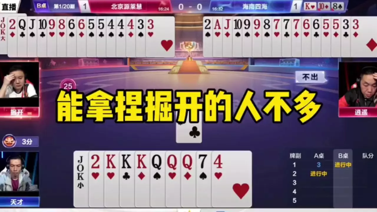 这是JJ斗地主冠军杯里的封神牌局,选手磊哥手握双王、KKKK等牌型,这局操作精彩到够他吹一辈子,另一桌选手却没能赢下这副牌,堪称JJ斗地主的神级对局。