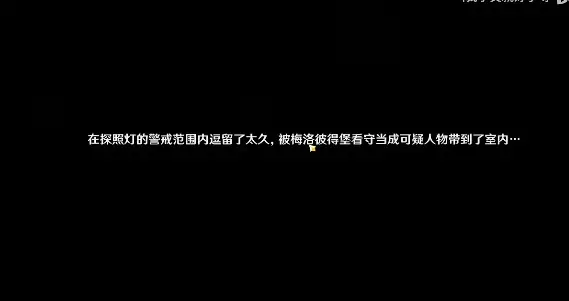 3、在探照灯的警戒范围内逗留了太久,被梅洛彼得堡看守当成可疑人物带到了室内。进入后,会遇到莫罗莱妮,玩家与他进行对话即可完成任务。