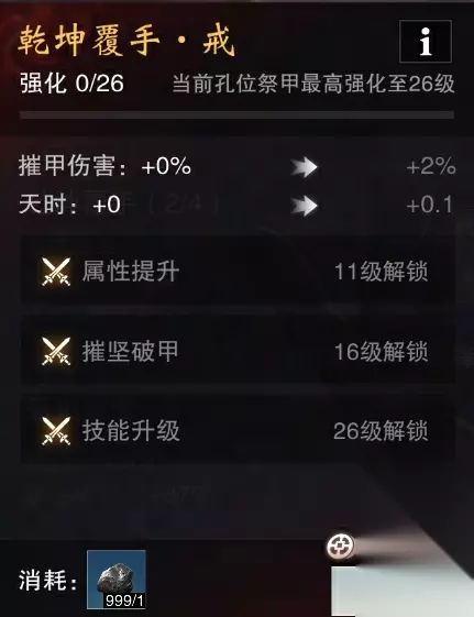 强化后的祭甲还将获得全新“摧甲伤害”、“深渊抗性”、“天时”属性,各个属性的效果为: (1)摧甲伤害:若自身摧甲伤害大于首领的摧甲抗性,则可以增加自身触发摧甲效果时造成的伤害。每位少侠的初始摧甲伤害为50%,最高可以增加至120%。当自身的摧甲伤害低于首领的摧甲抗性时,则造成摧甲时伤害固定为50%。 (2)深渊抗性:若自身“深渊抗性”高于首领的“深渊值”,则可以降低来自首领的伤害。若深渊抗性低于首领的深渊值,则不会受到任何影响。 (3)天时:少侠挑战每周的终绝积分本时,天时可以增加少侠在副本中造成的伤害。若少侠的“天时”数值大于副本层数,则会在副本内获得增伤效果。若“天时”小于或等于副本层数,则不会受到任何影响。在非本周积分本内,“天时”属性不生效。