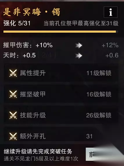 不同稀有度的祭甲拥有不同的强化上限,祭甲稀有度越高,强化上限也越高。若孔位强化等级超过穿戴祭甲的上限,则按祭甲上限生效哦~强化达到一定等级后,少侠需完成“突破任务”——即通关指定难度的终绝副本挑战,方可继续提升! 强化到指定等级时,少侠还有机会获得强力的“赛季词条”!“辩神”赛季中广受好评的“技能升级”、“摧坚破甲”等效果将荣耀回归!此外,还有全新词条等待少侠发掘,为战斗带来更多可能!
