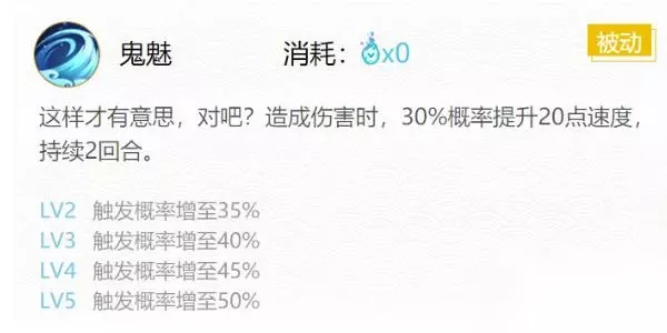 技能二:鬼魅(0火) 这样才有意思,对吧? 造成伤害时,30%概率提升20点速度持续2回合。