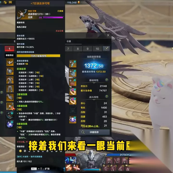 此外,银鹰召唤期间自身攻击力增加6%。这意味着,第二伙伴流派的玩法需要保证银鹰的长度,以提高自身的攻击力、伤害、buff的叠加和持续伤害,这是第二伙伴的核心玩法。 接着,我们来看一下当前版本的毕业装备——日月鹿套装和巨浪套。巨浪套的6套效果增加了20%的暴击率和30%的暴击伤害。巨浪套对第二伙伴的玩法提升非常大,因为银鹰是一个高频次触发伤害的职业。