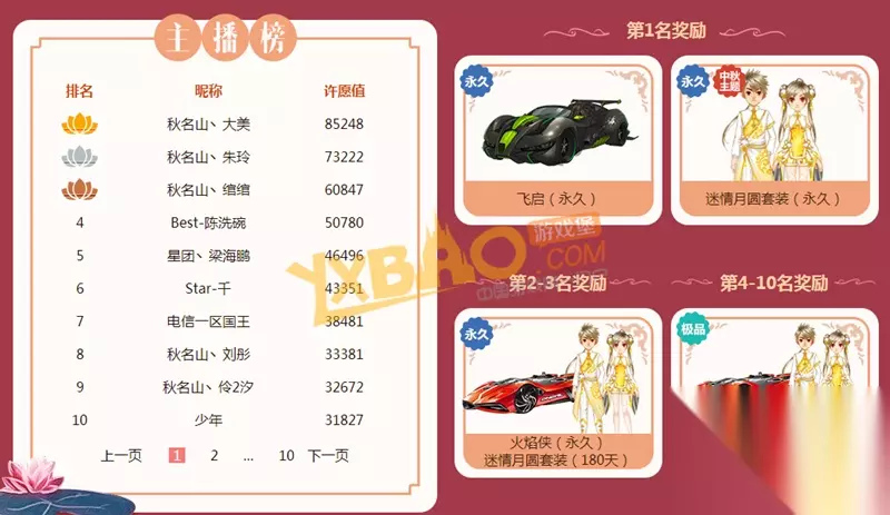 活动说明: 1.活动时间为:9月7日-9月19日。 2.玩家在星光秀场送给主播1个指定道具"天灯/佛/麦克风/旋木”,主播增加1许愿值,玩家增加1财富值。3.活动结束后,主播榜排行榜前十的主播可获得官方提供的许愿大奖。奖励将会在9月20日后,发放给成功上榜的主播! (注:排行榜每半个小时更新一次) 4.活动结束后,财富榜排行榜前十的玩家可获得官方提供的财富大奖。成功上榜的玩家,可在9月20日至9月25日领取财富大礼包! (注:排行榜每半个小时更新一次) 5.活动期间,玩家的累积财富值每达到一定额度,即可领取相应的中秋天灯礼包。(每个礼包单Q限领取一次) 6.本活动一切解释权归QQ飞车所有。 看了上边这篇《QQ飞车》中秋放天灯 许愿赢永久,各位玩家是否都了解相关信息了呢!找精彩好玩手机游戏请浏览233乐园。 如转载涉及版权等问题,请作者与我司联系,我司将在第一时间删除或支付稿酬。