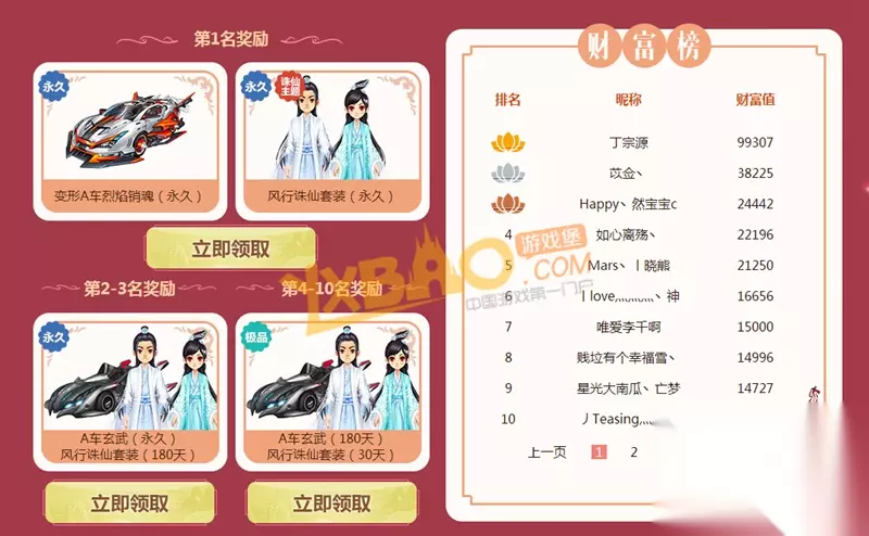 二、财富排行 成功上榜的玩家,可在9月20日至9月25日领取财富大礼包!(注:排行榜每天刷新一次)