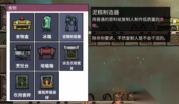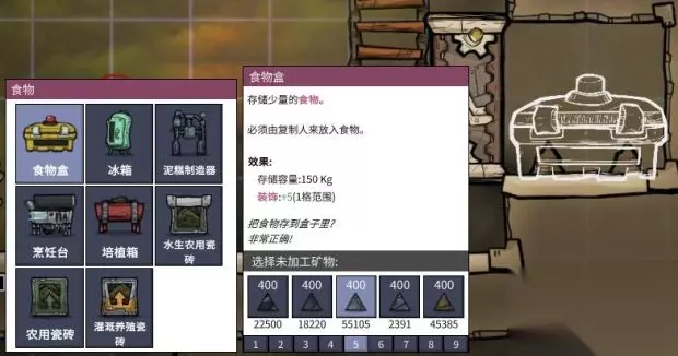 现在虽然我们可以吃土但是如果吃的东西不被冷藏的话会坏掉。左下角食物列表有冰箱可以冷藏食物,但是冰箱耗电。所以这里教给大家真空存食物法。我们都知道真空是无菌的非常适合保存食物。