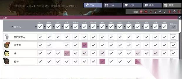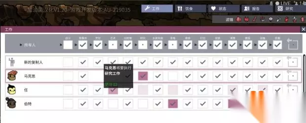 小人会去做你选择的打勾的任务白色为不推荐,粉色为推荐,红色为强力推荐。看个人属性系统决定颜色分类。这个界面很有用处你可以选的你的小人去做你想要做的事情。这里马克思的研究属性最高让他去做研究的话就把下面两个小人的研究选项取消掉就好了。另外战斗属性全部取消!!!战斗属性全部取消!!!战斗属性全部取消!!!重要的事情说三遍,我们都是文明人不需要任何战斗。