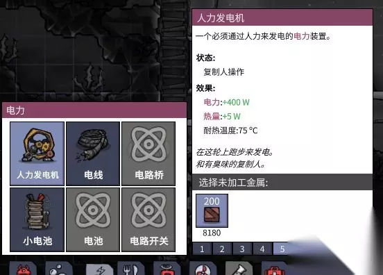 接下来我们材料够了找左下角电力分类人力发电机这个东西可以用来发电但是要有一个人上去跑步所以俗称老鼠笼。
