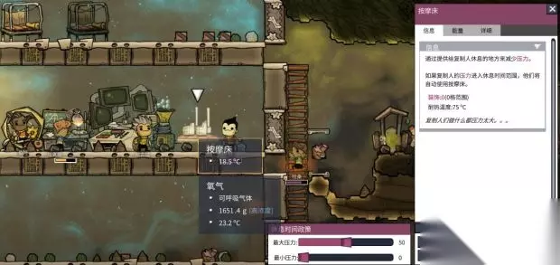 我们把它做出来装上电线最小压力调整为15最大压力调整为35这个值不是固定的随便你们怎么调只要不是太大就行。然后优先度一定要是9!不管任何情况下按摩床的优先度一定要是9。 第十天的时候我们发现,食物不够吃了。怎么办呢?左下角食物。