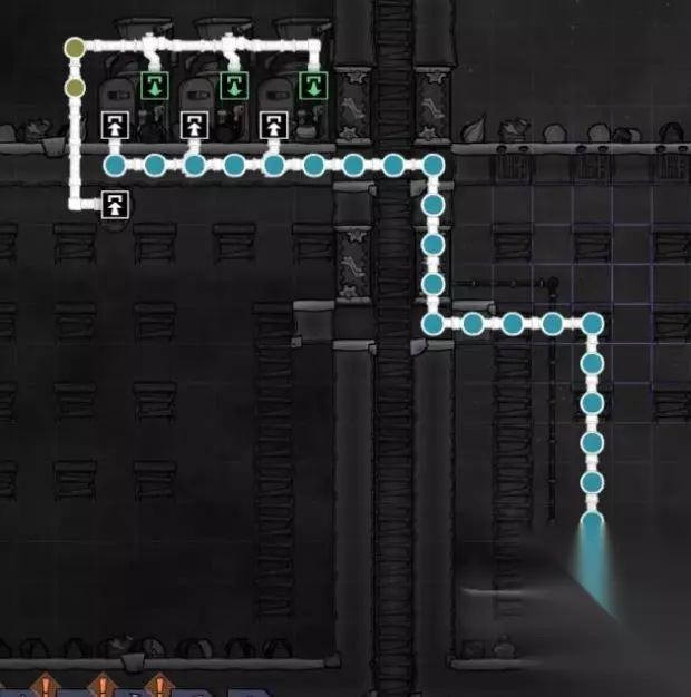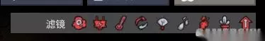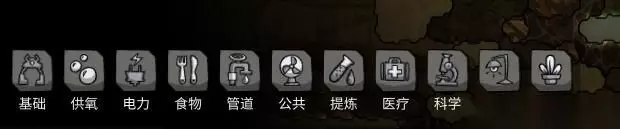 接下来是滤镜,可以观看全局的各种整体数据分布。从左到右依次为:氧气滤镜(括号内为快捷键F1)电路滤镜(f2)整体温度滤镜(f3)舒适温度滤镜(f4)光线滤镜(f5)液体管道滤镜(f6)气体管道滤镜(f7)装饰度滤镜(f8)任务优先度滤镜(f9)。