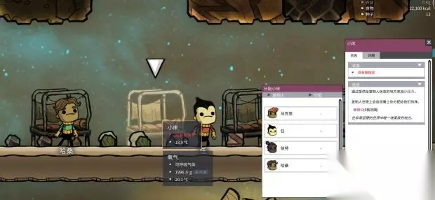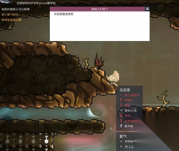 F1氧气滤镜看到工作间没有氧气了,现在这个游戏的精髓就来了:缺氧!缺氧了怎么办呢?