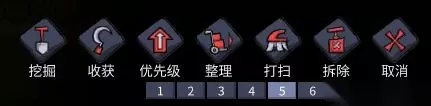 屏幕右下角依次为:挖掘(G)收获(T)小人任务的优先级(P)散落在地上的资源整理(K)打扫地面(M)拆除已经建造的物品(X)取消你已经下令的任务(C)再往下1-9为任务优先级设置默认为5这里说下优先级比如一个优先级为5另外一个为6你的小人会先把优先级为6的任务做完再去做优先级为5的任务这个用好有奇效。