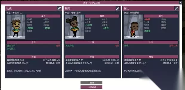 点开之后会有三个人让你选择但是只能选一个剩下的两个不能选而且不想刚开始那样可以随机了属性都是固定的,所以你要仔细考虑需要什么属性的小人。如果全部都不想要的话最下角有一个全部拒绝按钮。这里我们选择第一个。