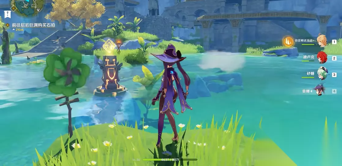 第四处图腾的解谜流程最为繁琐,涉及三种元素配合。玩家首先需用风元素攻击水边的风车草使其旋转,随后迅速用冰元素搭建通往水中图腾的路径,最后在10秒内用岩元素激活图腾。若超时需重新触发风车草。此处对操作节奏和角色切换有较高要求,建议提前规划好行动路线。