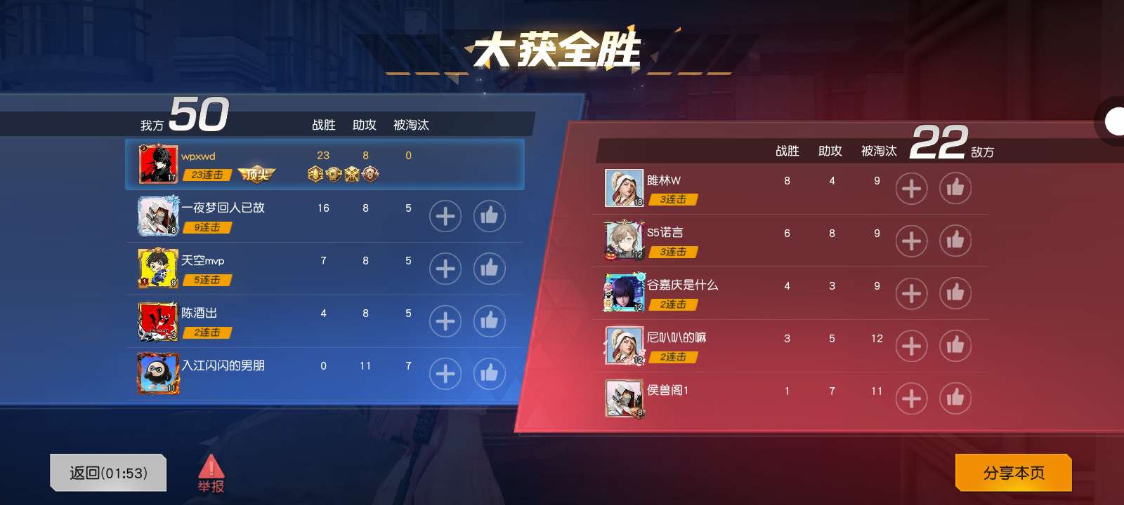 战胜23 助攻8 被淘汰0 23连击(菜鸟玩荒野行动) :)