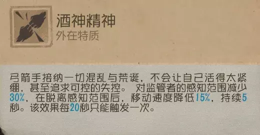 弓箭手的感知范围(心跳示警范围)减少30%,在脱离感知范围后移速减少15%该效果每20秒只会触发一次。