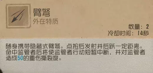 点击发射后会后跃一些距离,可以短暂中断监管者行动,并对监管者造成50的重伤撕裂度。