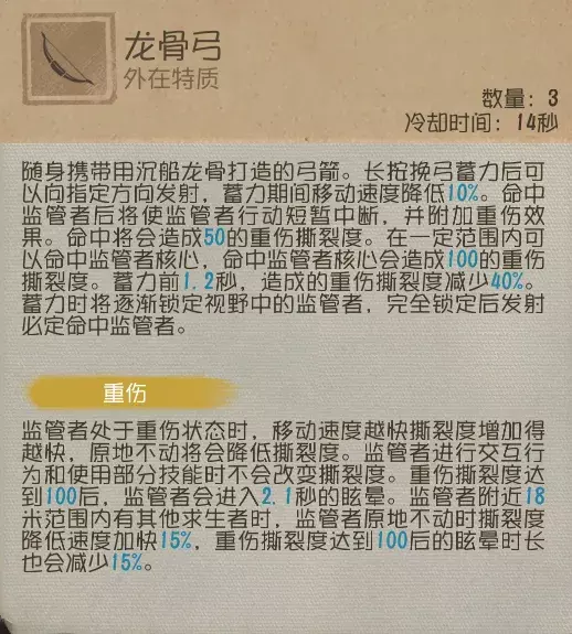 ③ 重伤状态下监管者正常移动时撕裂度增长较为缓慢,在使用龙骨弓命中监管者后先正常进行牵制,等撕裂度较高时再考虑转点;