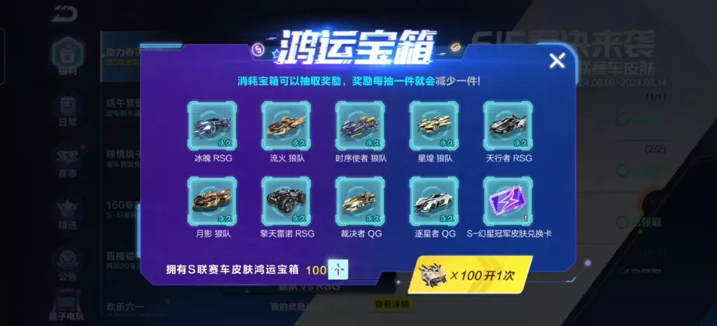 恶魔骑士鸿运宝箱,相信看见这个名字就知道这个箱子的机制是什么。没错,就是个极地战甲鸿运宝箱一样的机制,而这个箱子中的物品不仅有恶魔骑士这款摩托还有着一些别的物品,分别是:柠檬黑茶配饰、游鲤水袋、潮黑酷白眼镜以及恶魔骑士。
