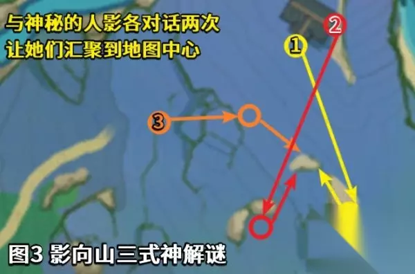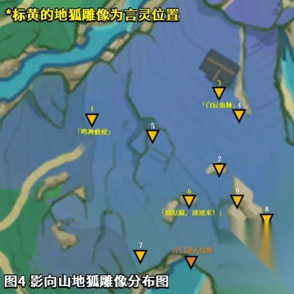 (3)前往鸣神大社调查。 (4)回到荒废神社,利用「留念镜」调查。 解谜攻略:使用小道具「留念镜」,观察特殊的「地狐」雕像,可以看到过去发生的影像。活用元素视野,「地狐」雕像在元素视野下是白色的。 地狐雕像点位见图4: