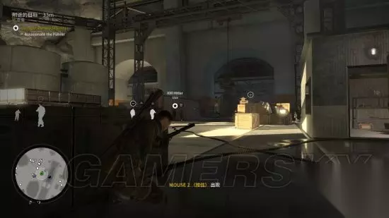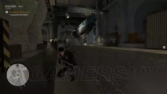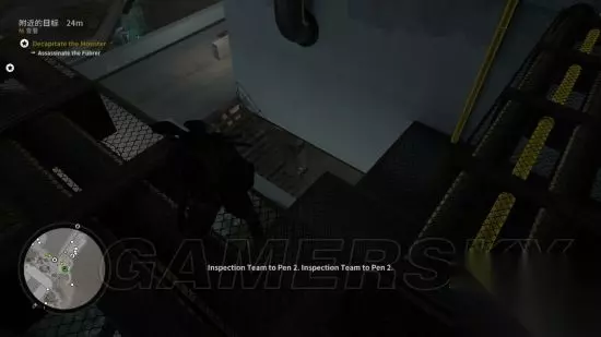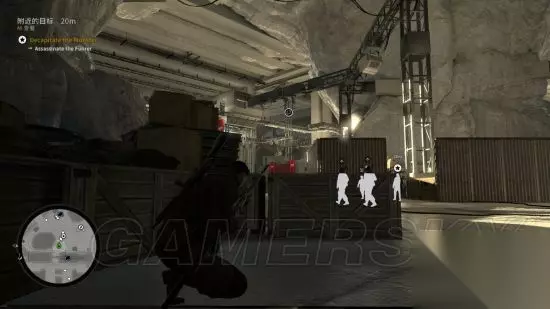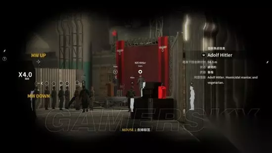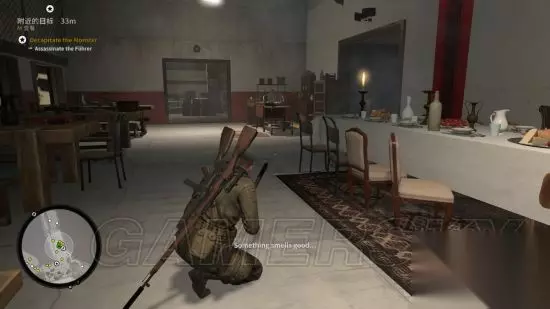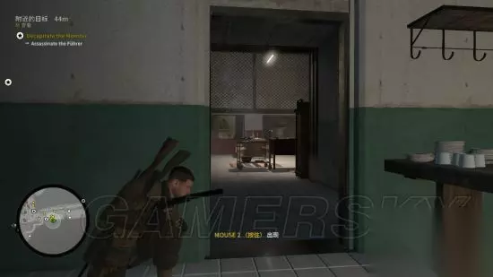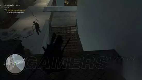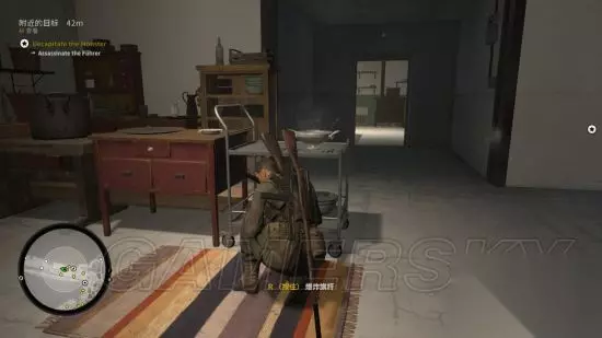 从隐藏通道降落,这个时刻可以直接看到元首从左往右走,由于元首移动速度实在太快,建议往他身后丢石头,使其警戒,以争取足够时间在食物动手脚