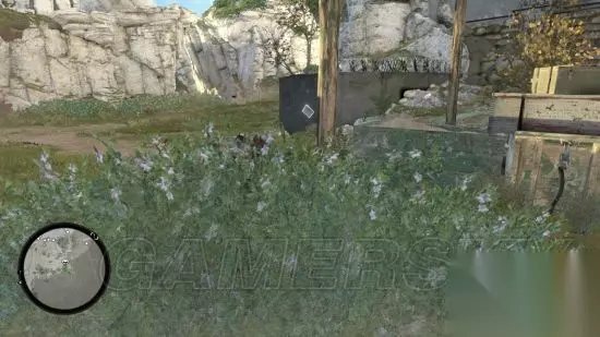 贴着右边界一直跑,沿途敌人用手枪干掉。 到达这里小心前面有一座机枪碉堡,继续贴边蹲着在草丛间快速移动不会被发现