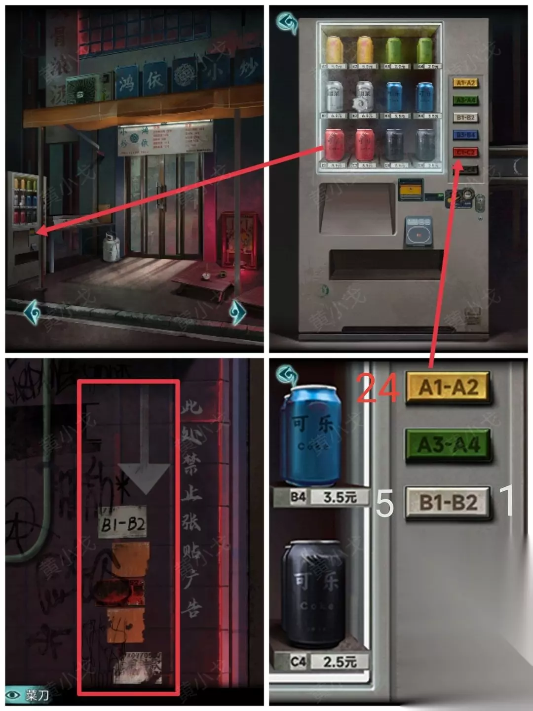 13.(小炒店外)点击自动贩卖机,根据贴在墙上的广告,按(白橙红橙白)的顺序点击对应颜色的按钮