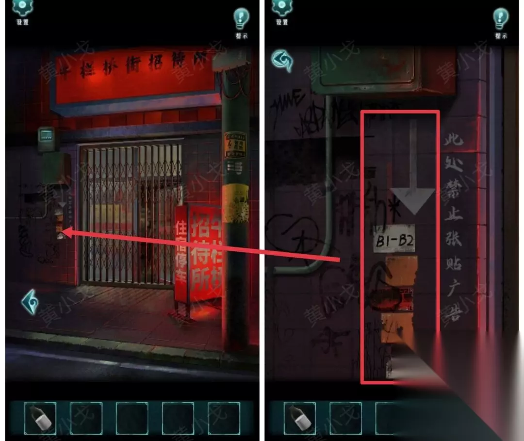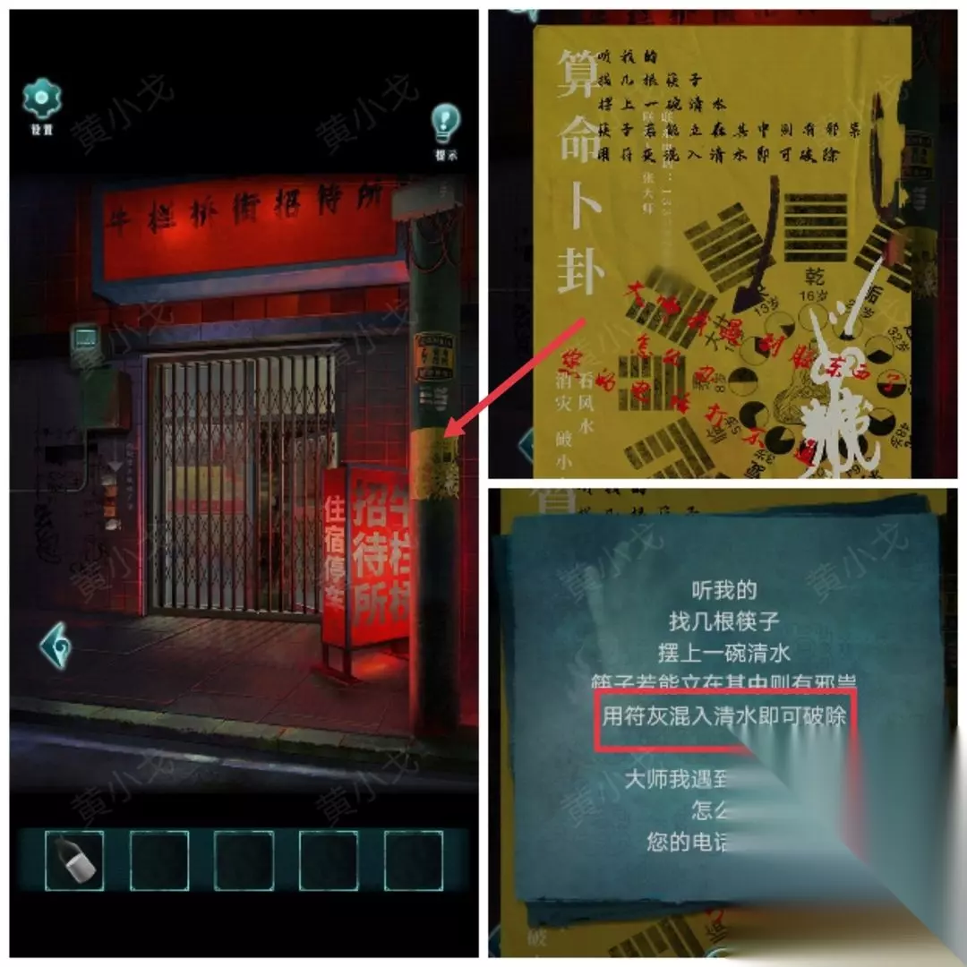 11.(招待所外)点击查看贴在电线杆上的广告,获得线索(用符灰混入清水可以破除)