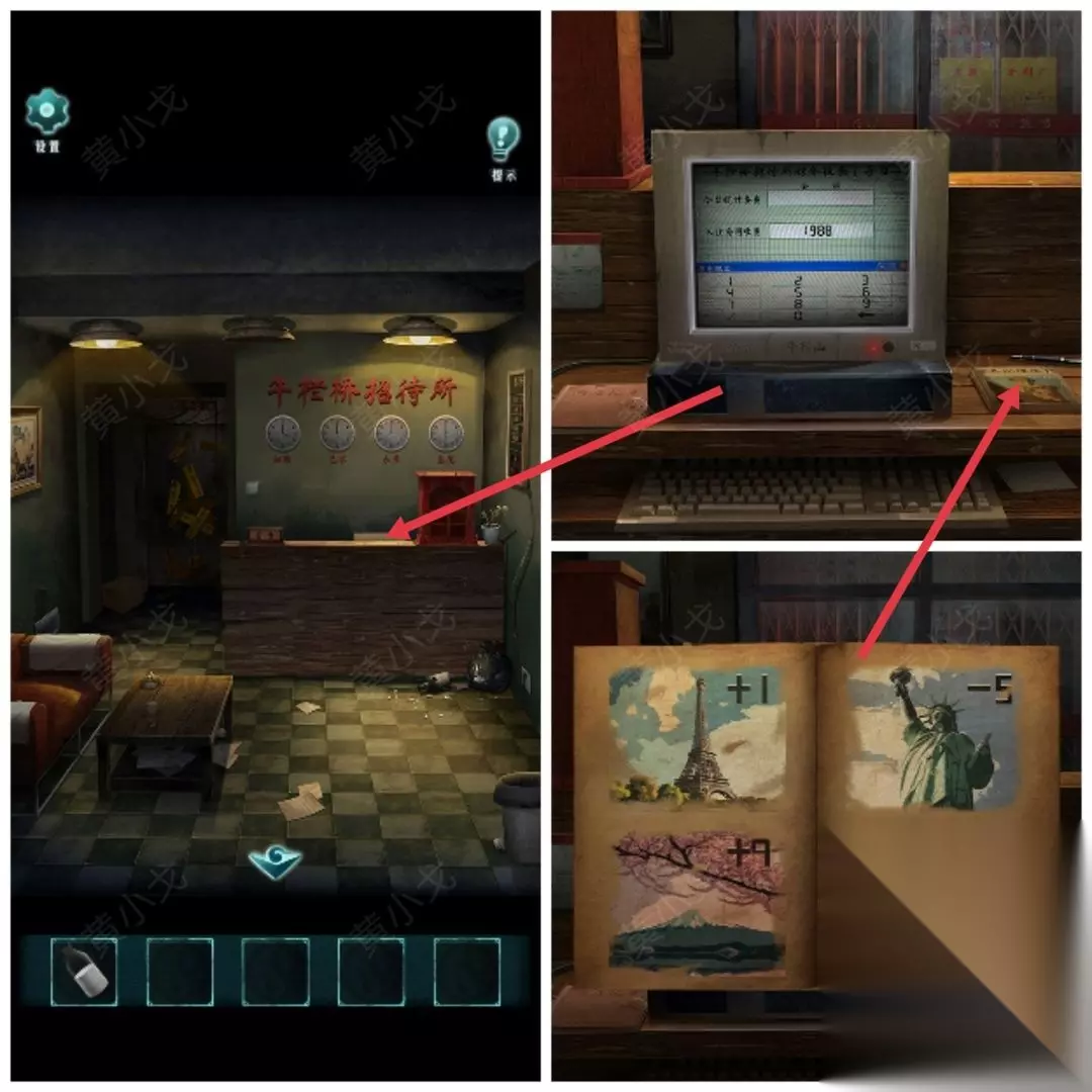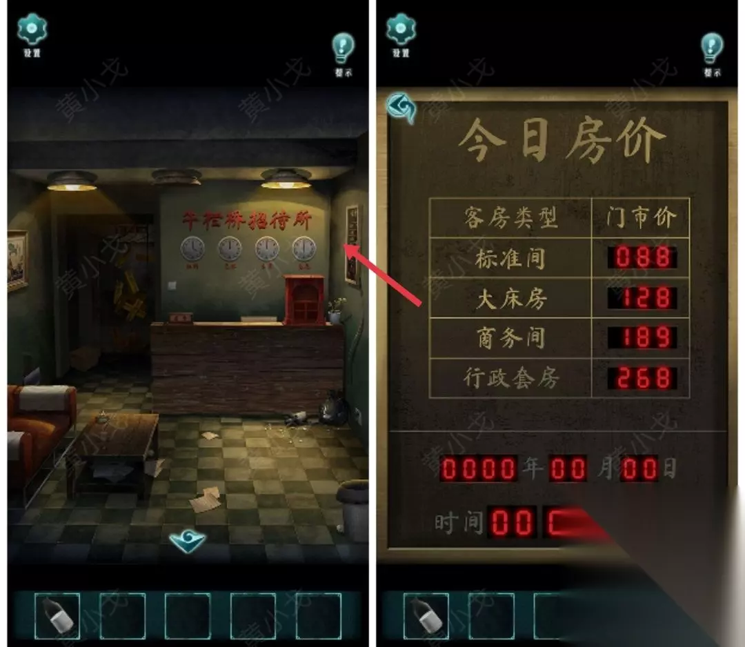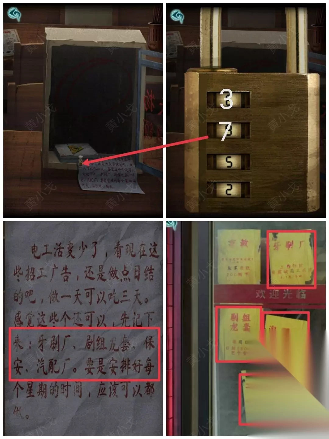 12.点击箱子里的盒子,根据纸条上的线索,结合招待所玻璃门上的招聘广告,输入密码:3752(纸条上的职业对应玻璃门上的招聘广告,密码是对应的时间)