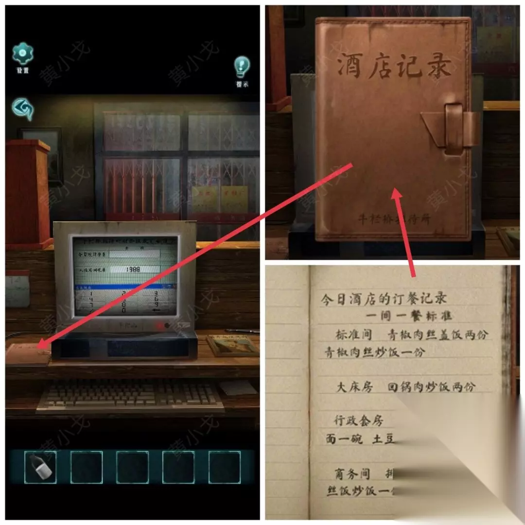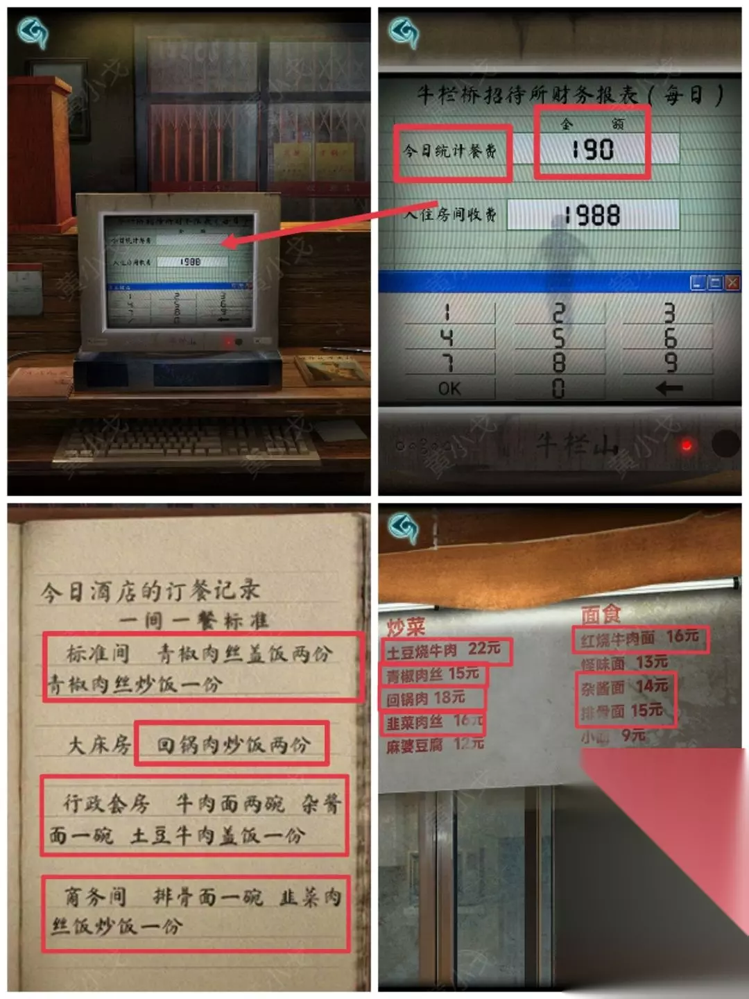 5.点击电脑,根据《酒店记录》上的线索,结合小炒店价格牌上的线索,输入餐费金额:190(青椒肉丝盖饭两份:34、青椒肉丝炒饭一份:16、回锅肉炒饭两份:38、牛肉面两碗:32、杂酱面一碗:14、土豆牛肉盖饭一份:24、排骨面一碗:15、韭菜肉丝饭炒饭一份:17)(小高能?)