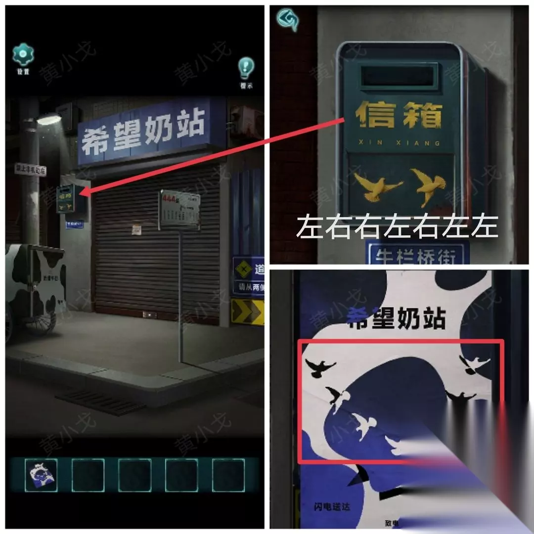 4.点击信箱,根据【海报】上的线索,按(左右右左右左左)的顺序点击箱子上的信鸽按钮