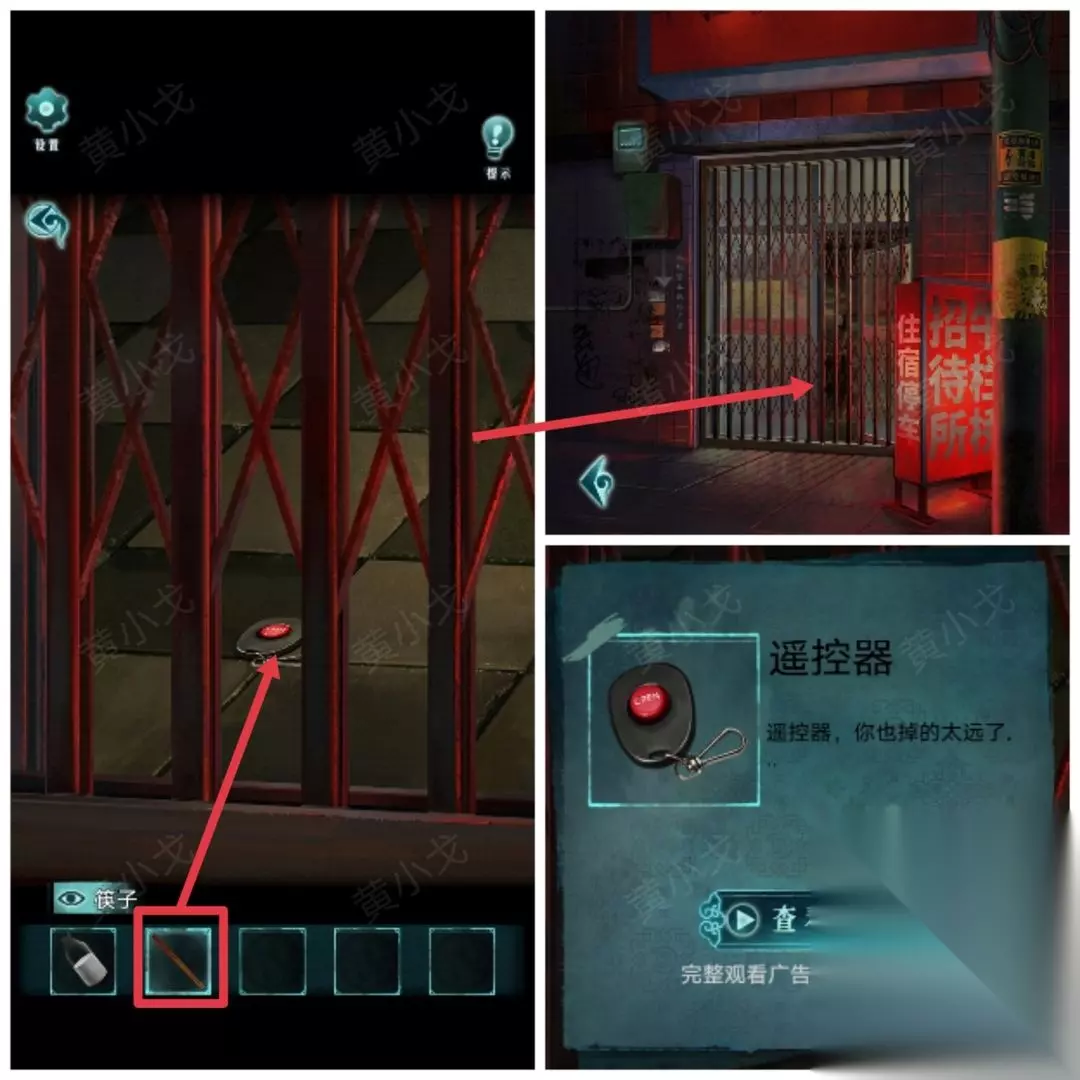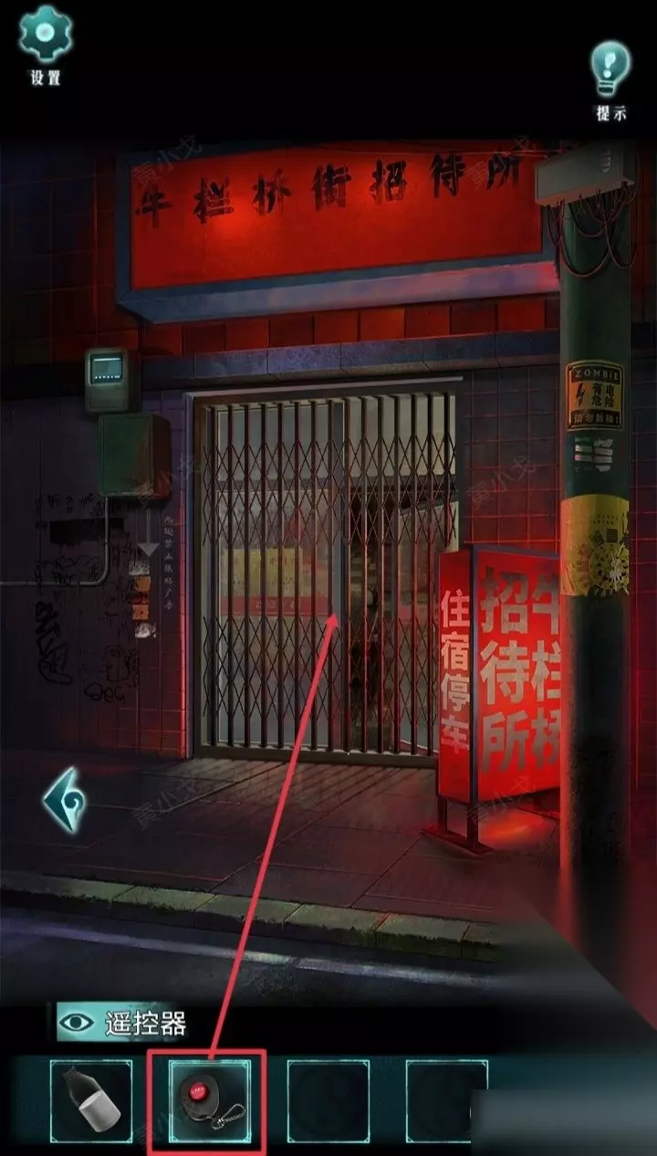 22.(招待所外)点击铁门,用【筷子】夹门里面的【遥控器】