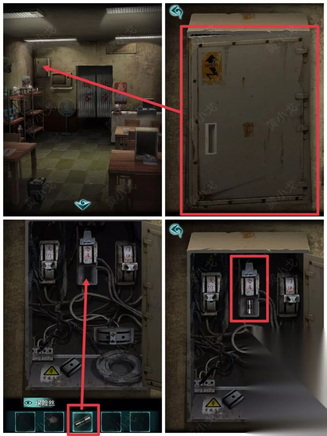 15.点击电箱,打开,装上【保险丝】,打开仓库的电源