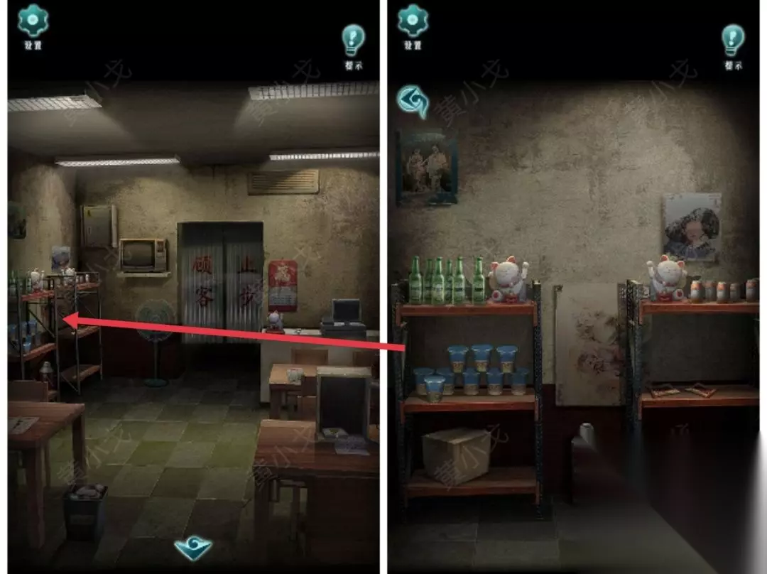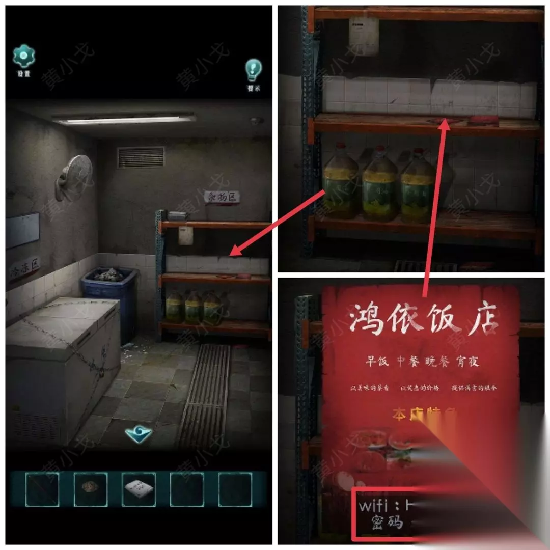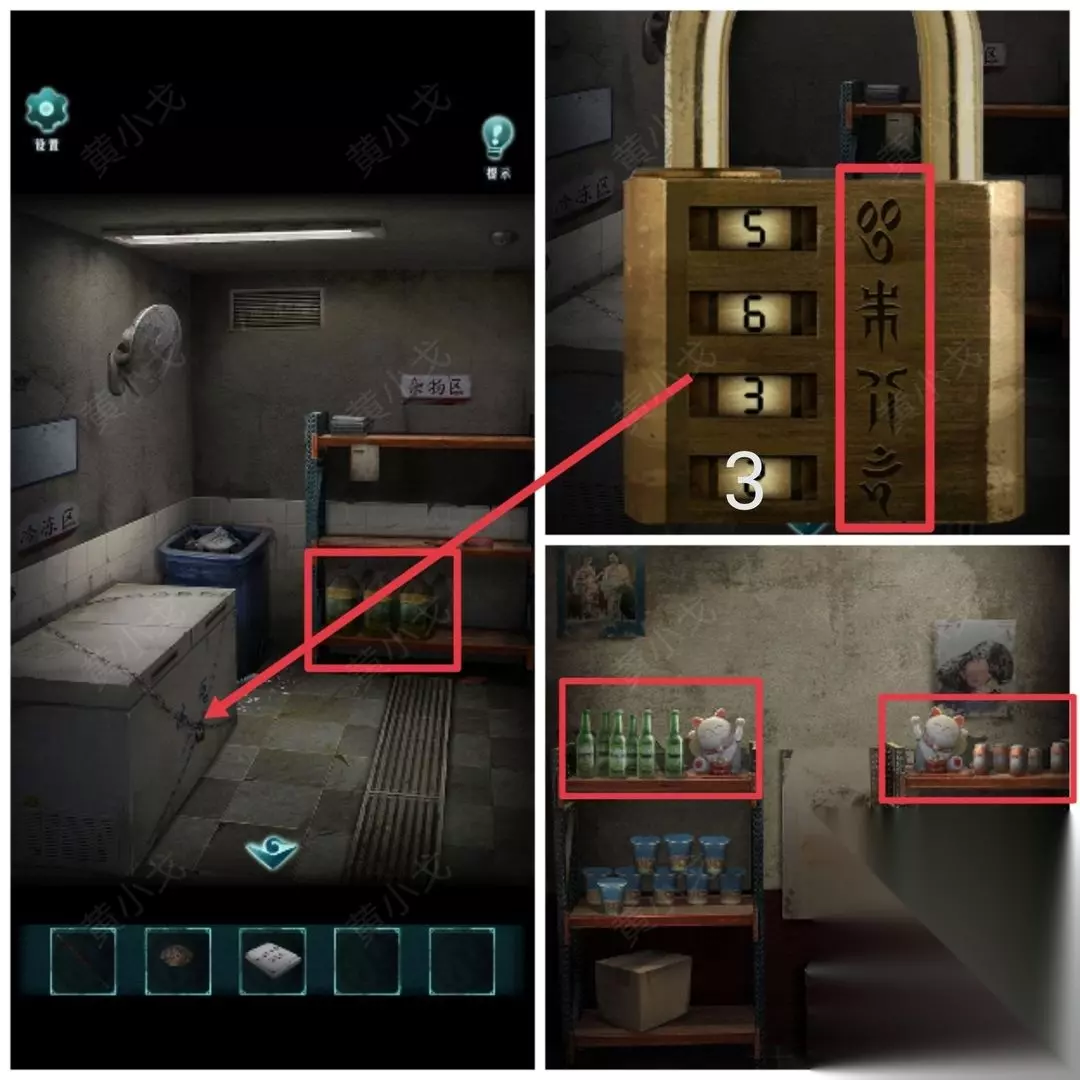 20.(小炒店-仓库)点击冰柜上的密码锁,根据上面的符号提示,结合照片上的线索和置物架上的线索,输入密码:5633(招财猫柜台上还有一个)