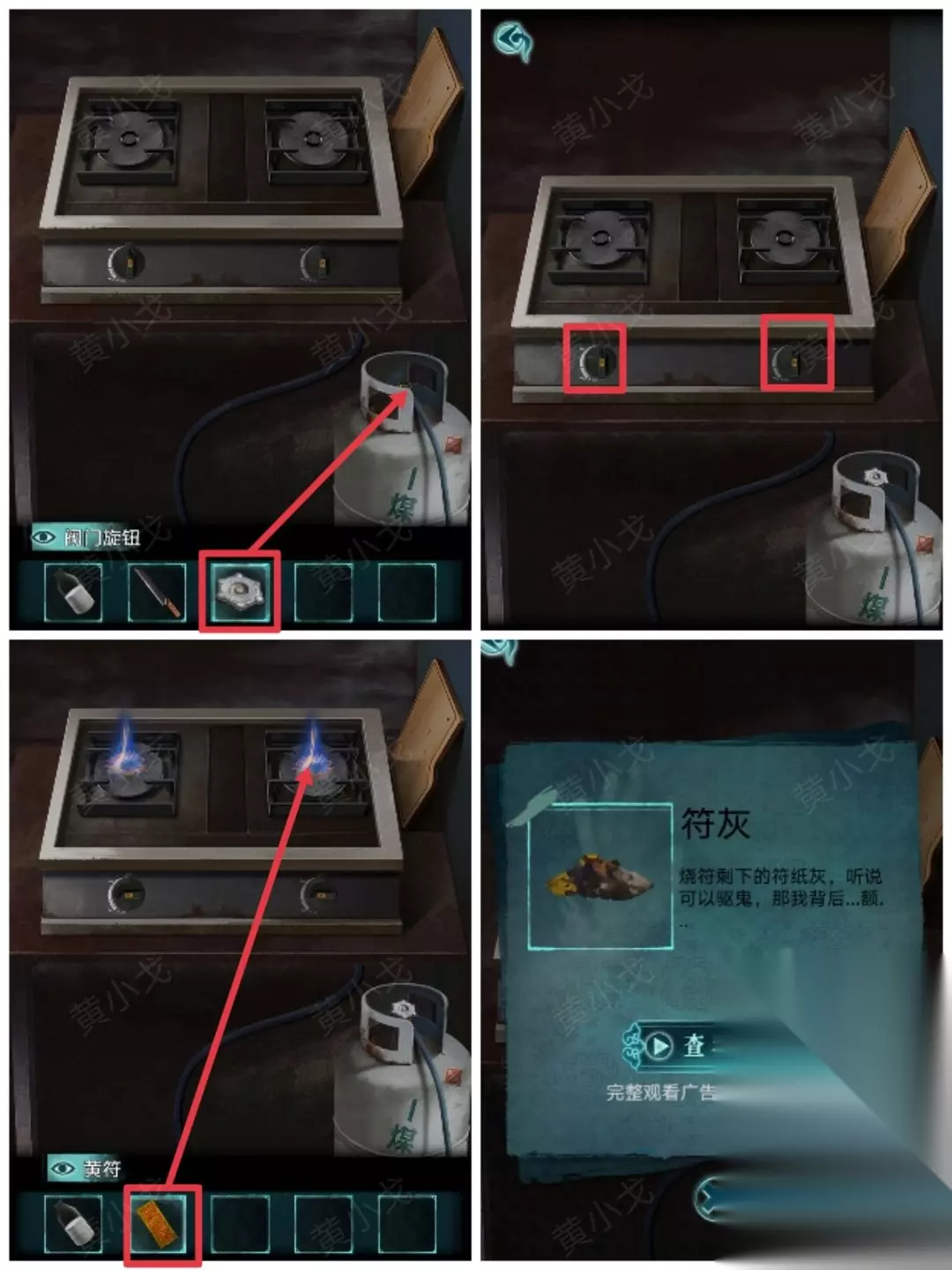20.点击煤气罐,装上【阀门旋钮】;打开开关,烧【黄符】,获得【符灰】