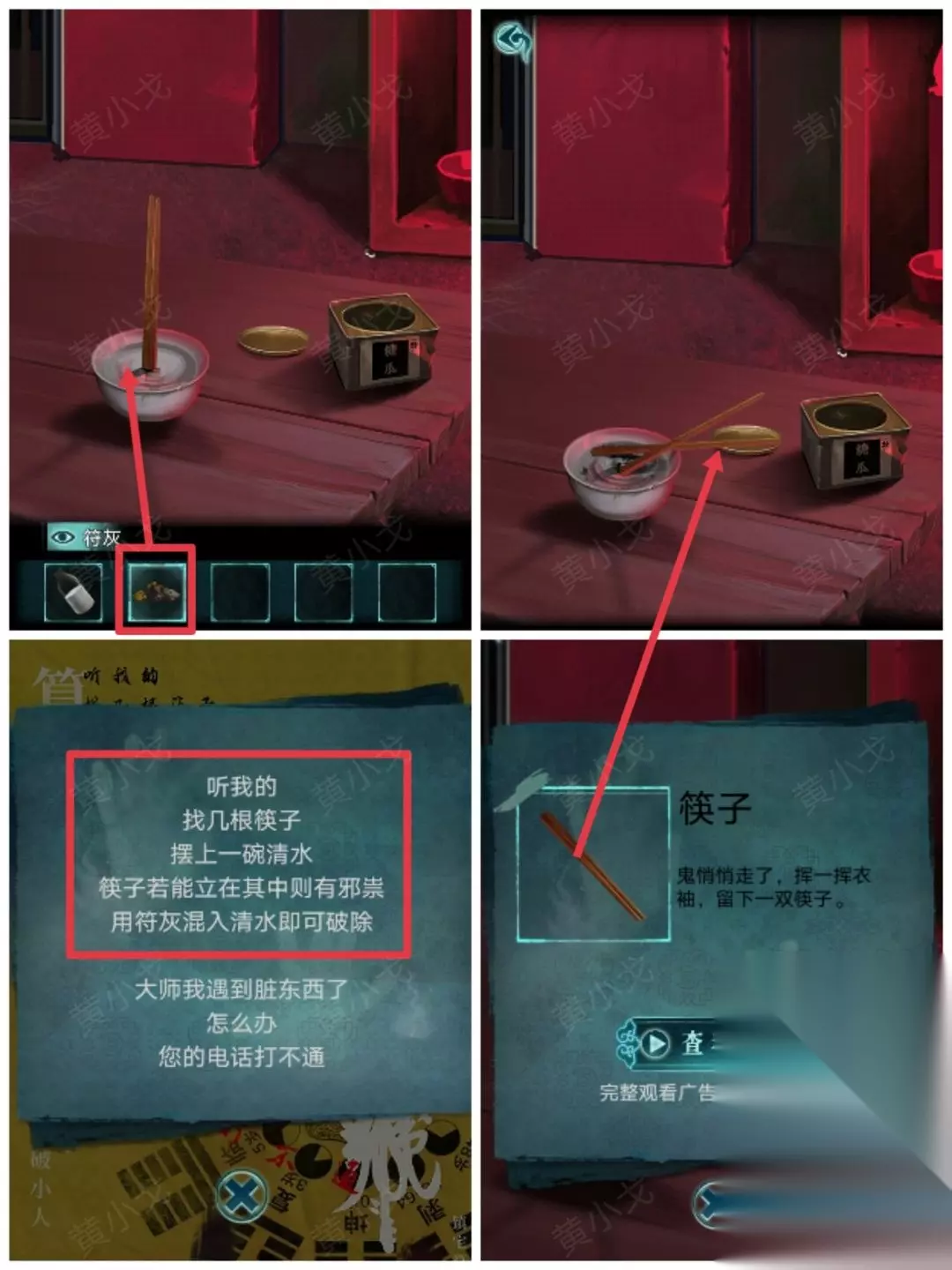 21.点击桌子,根据广告上的线索,把【符灰】放入清水中,获得【筷子】