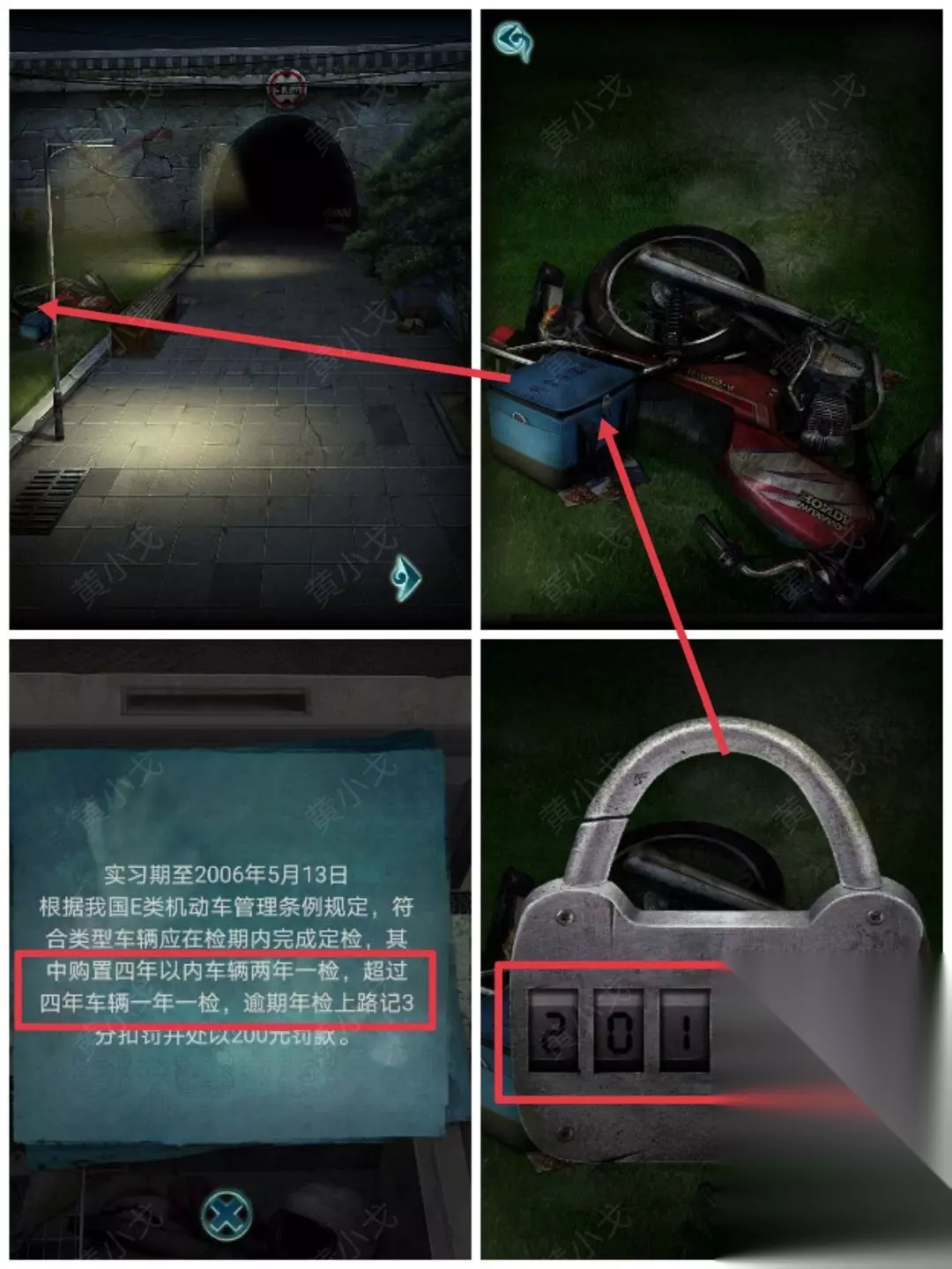 22.(街道)点击外卖箱上的密码锁,根据驾驶员上的线索(四年以内车辆两年一检、四年车辆一年一检),和年检信息表上的线索(年检已经超过四年,所以是一年一检),输入密码:201207