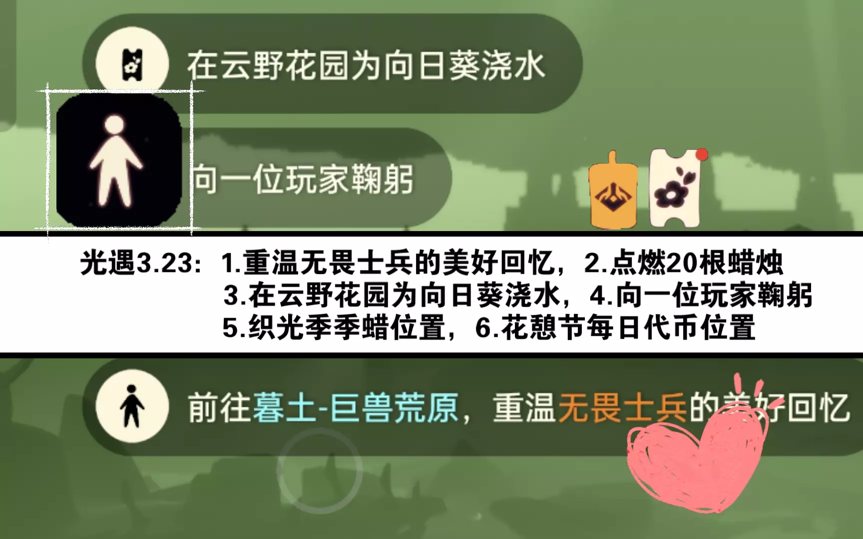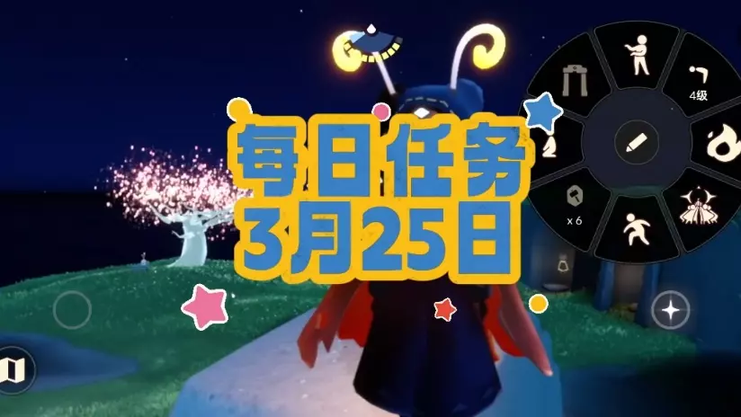 云野赏花任务的关键位置位于云野大厅左侧的小山坡上,具体坐标为衣柜正对面的区域。进入云野地图后,玩家需要直接向左飞行,抵达带有先祖石碑的山顶平台,此处可见石凳和小树苗组成的赏花点。完成方式为靠近小树苗静候其生长约一分钟,期间无需任何操作,待系统提示任务完成即可获得相应奖励。