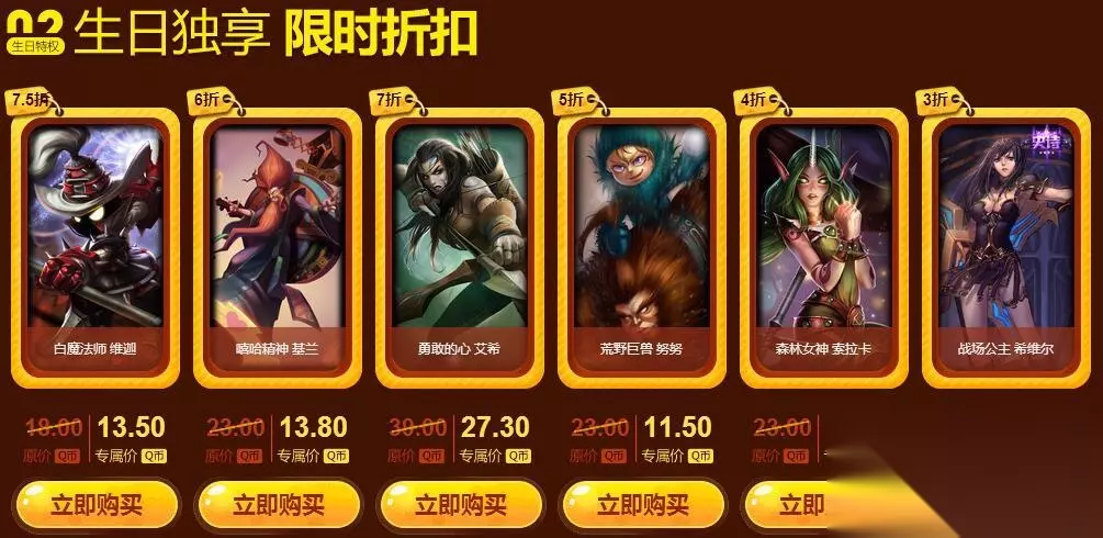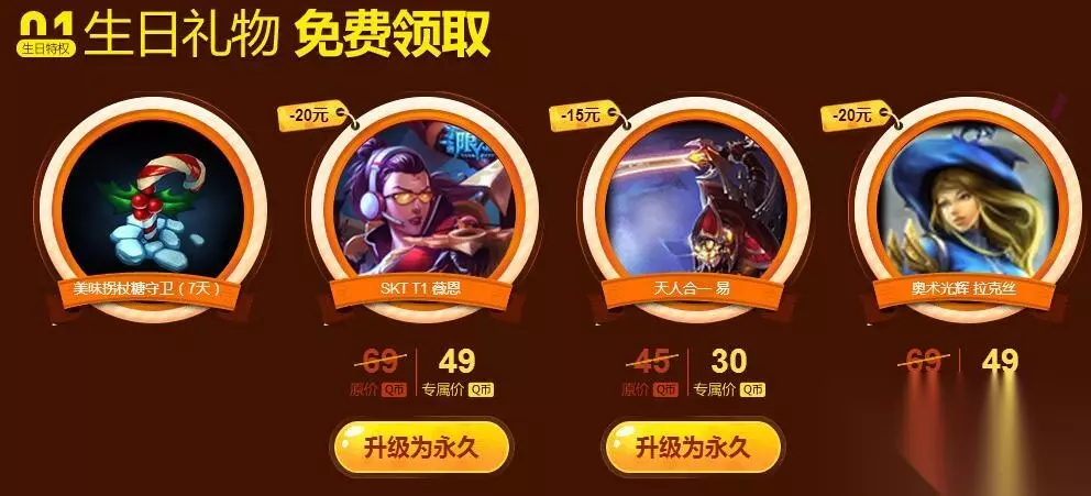 活动规则及FAQ 问:我收到了生日惊喜!我可以在这里做什么? 答:生日快乐,召唤师!我们准备了一份生日礼物,还有专属于你的折扣皮肤,赶快去看看吧! 问:我如何知道自己是不是过生日? 答:每位召唤师生日按照单个大区召唤师的注册日计算,当月有效。例如,召唤师小明2011年11月11日在祖安大区注册角色,他在2016年11月任一天(如11月22日)登录祖安大区,收到了生日惊喜! 问:谢谢你们!我可以把全部的折扣道具都买了吗? 答:单个大区生日礼物只会有一份哦,专属于你的折扣道具可以全部购买,请把它们带回家吧。 问:我收到了1个免费领用的7天期限英雄,可否优惠升级为永久呢? 答:抱歉召唤师,优惠升级为永久目前仅限于期限皮肤,暂未对期限英雄开放。 如转载涉及版权等问题,请作者与我司联系,我司将在第一时间删除或支付稿酬。