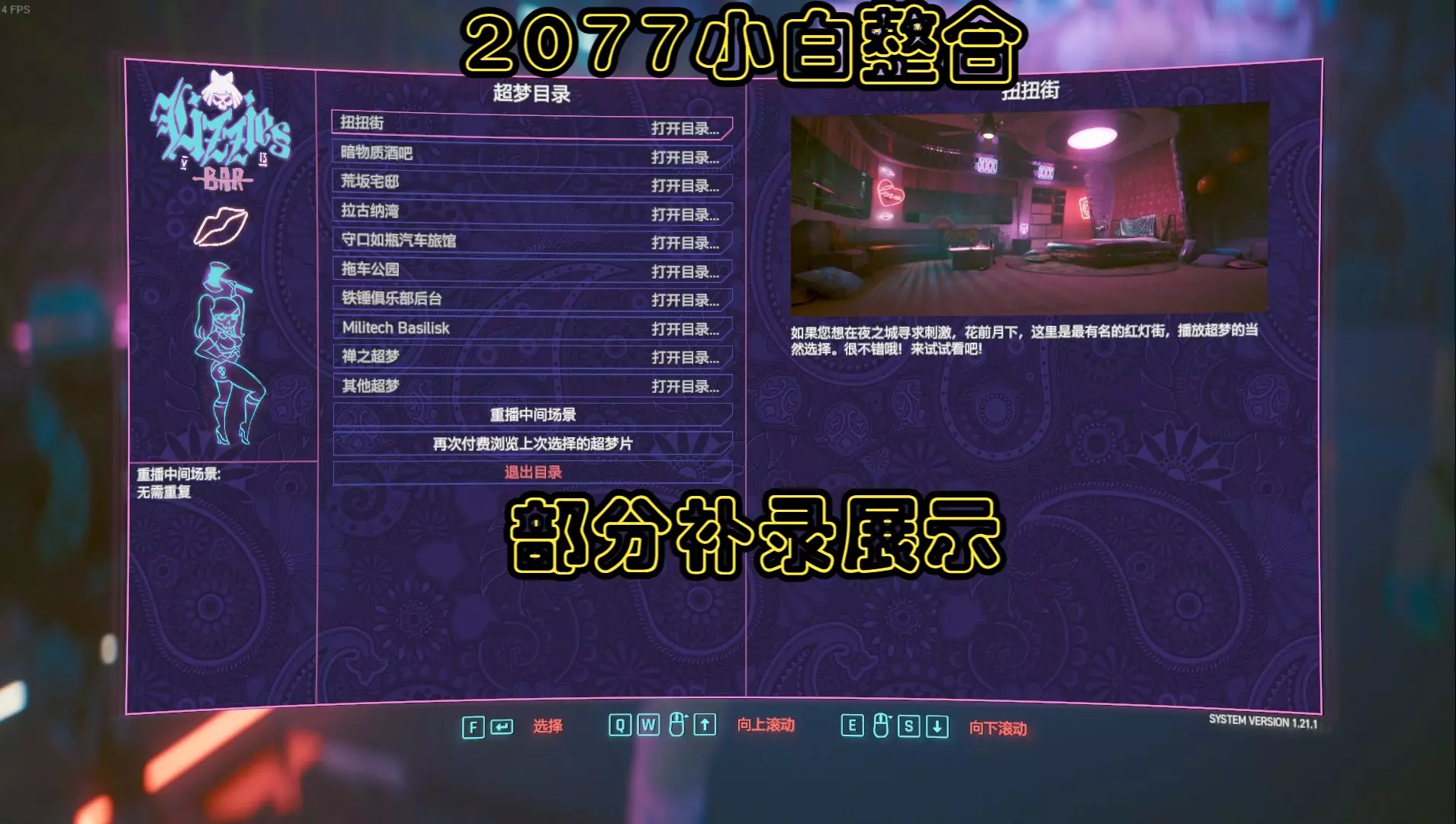 2077小白整合包的部分展示。由于之前的视频麦克风没弄好,现在再录几个。 浮空车、 丽姿色超梦(可能是你想的那种)、 女V攻略帕南、 全息导航、 添加的自定义电…