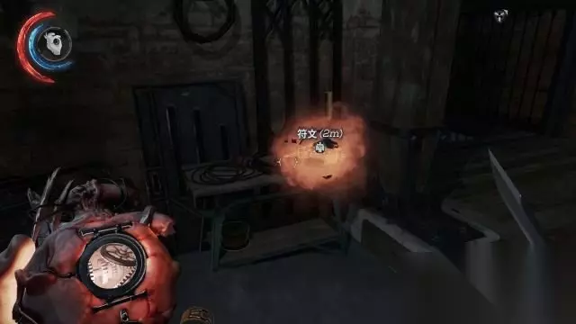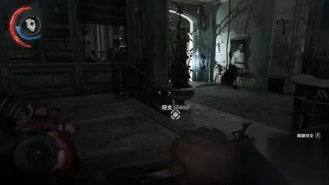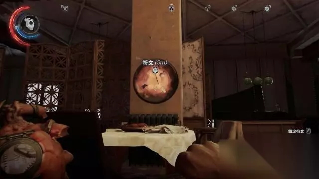 符文×6 去到餐厅,要注意往黑白字体墙纸走去的守卫先不要解决,因为在右侧屏风处有两名就餐的守卫,捡起附近的瓶瓶罐罐往黑白字体墙纸扔去,将这里吃饭的两人引开以后可以在他们吃饭桌的柱子上拿到一个符文。