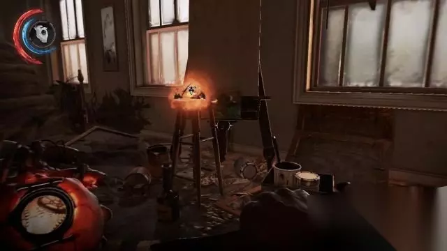 进入电梯内,启动电梯令其往上升(那么才有势能击穿地板),然后爬到电梯上方的逃生出口上,用十字弓击中钢索的两段红色部位,那么电梯就会击穿地板,阿塔诺就可以进入到失物招领处内。 在左侧的储物架旁边可以找到一幅画作——《减法光源中的安东·索科洛夫》。