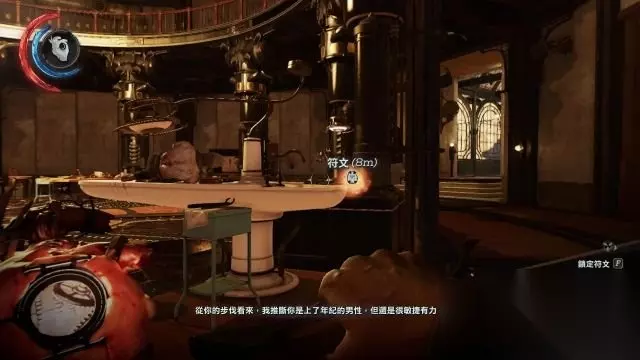 进入电梯内,启动电梯令其往上升(那么才有势能击穿地板),然后爬到电梯上方的逃生出口上,用十字弓击中钢索的两段红色部位,那么电梯就会击穿地板,阿塔诺就可以进入到失物招领处内。 在左侧的储物架上拿到一个符文。