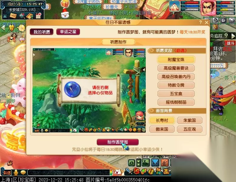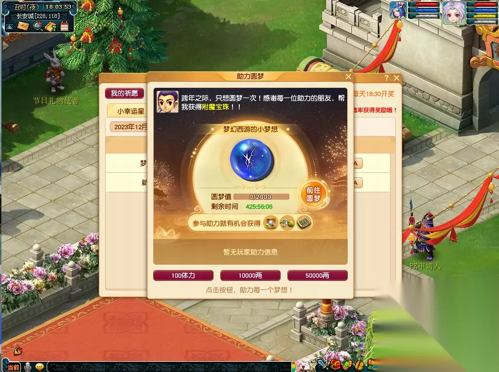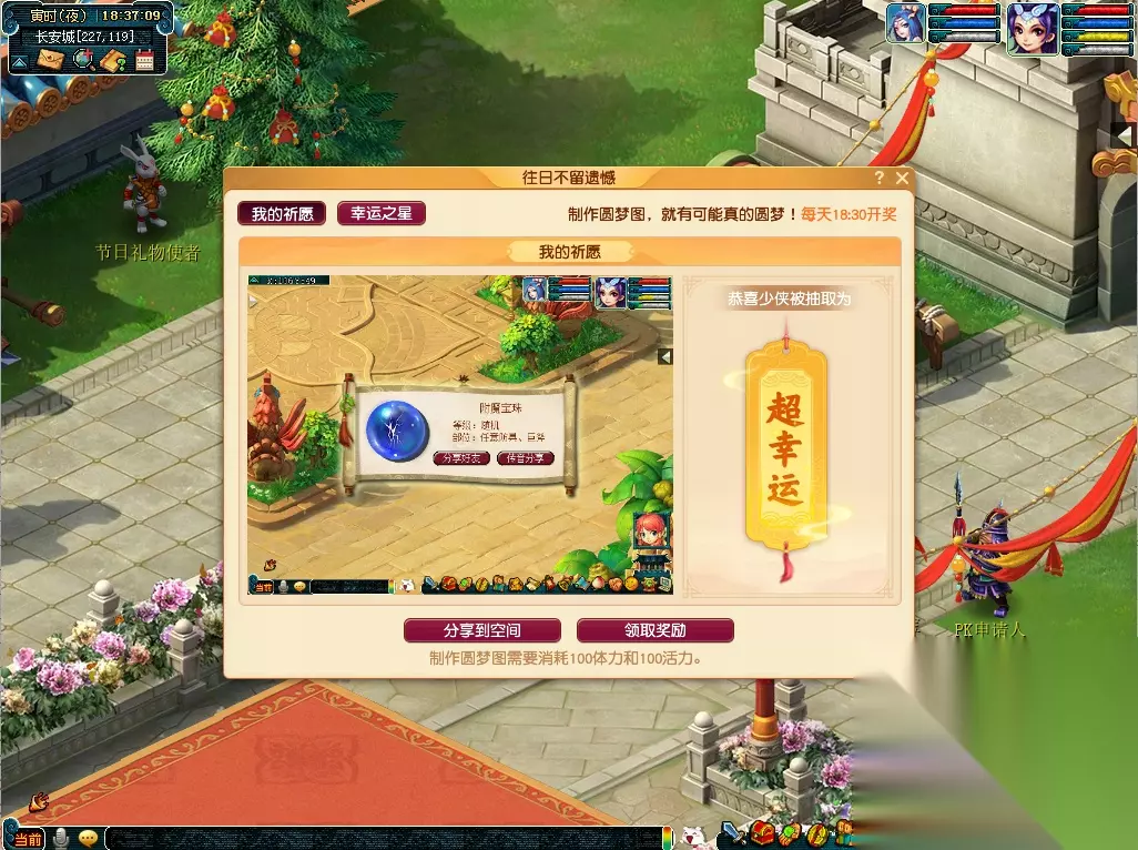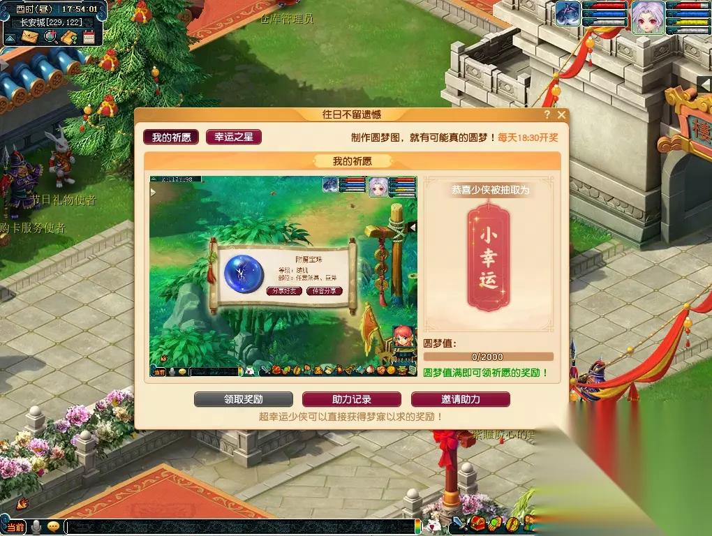 小幸运玩家可以邀请好友为自己助力,获得圆梦图中的奖励!帮助其他少侠圆梦的玩家也有概率获得五宝、魔兽要诀、超级金柳露、宝石等奖励!