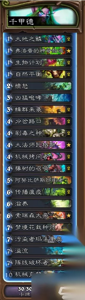 需要注意真菌宝藏的使用时间,遇到快攻不要怕弃掉随从牌,就算是真的弃掉随从也可以防鬼抽增加抽到解牌的几率,打慢速卡组后期可以抽三张青玉护符迅速养大青玉魔像。 二、千甲德 这套牌的弱点比青玉德要大,毕竟饿鬼一撕想翻盘就不容易了,但并非毫无希望。