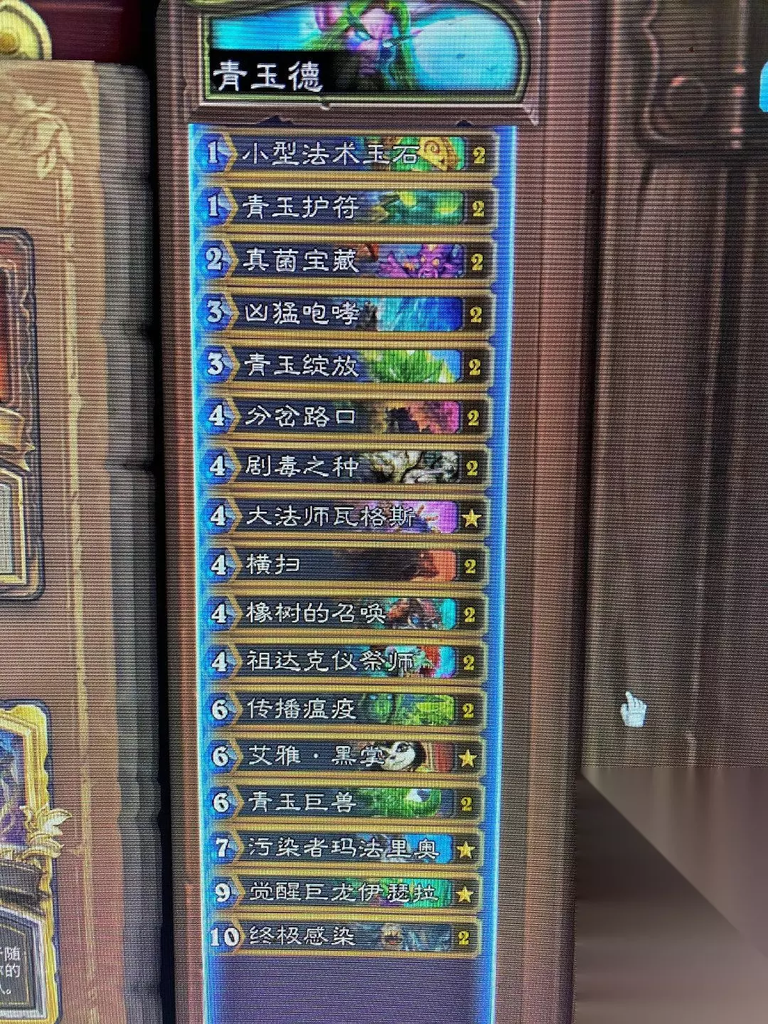 接下来就让小编给大家带来炉石传说德鲁伊卡组2024,觉得这篇文章对您有用的,别忘了多多关注本站哦! 一、青玉德 青玉护符是对于后期卡组的一种克制方法而不是我们的制胜方法,在判断出对面是控制卡组之前,护符能丢就丢,还可以养养青玉魔像,靠后面的暗雅、巨像占据场面。遇到恶魔猎手,两张分岔路口24点甲直接劝退对方,加上大法师格瓦斯叠加瞬间爆炸。