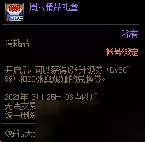 帐号绑定 开启后,可以获得1张升级券(Lv50~99)和20张奥妮娜的兑换券。 2021年3月25日06点以后 无法交易或使用 统一删除 DNF2020活动 欲望之塔