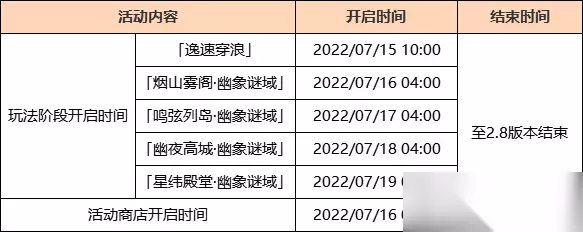 参与条件: 冒险等阶≥32级 完成魔神任务:第二章·序幕「振袖秋风问红叶」 且完成莫娜传说任务:映天之章·第一幕「在此世的星空之外」 活动期间,接取莫娜传说任务所需的冒险等阶也会调整至32级,完成莫娜传说任务后体验更佳。 ※ 活动期间,如果没有完成莫娜传说任务,可在活动界面通过「快速体验」参与活动。 五、全新衣装 迪卢克——「殷红终夜」 ◇迪卢克隐秘行动时所穿的衣装之一,如阴影之中翻腾的火焰。敌人视野尽头所留下的殷红残痕,即是他们余生挥之不去的梦魇。 菲谢尔——「极夜真梦」 ◇皇女菲谢尔的祭礼着装。愿高贵的人永远葆有勇气、诚挚与善心,如此,邪恶必无法挫败她。 六、全新剧情 1.全新传说任务 枫原万叶传说任务——枫红之章·第一幕「陌野不识故人」 2.全新邀约事件 邀约事件·鹿野院平藏 第一幕「风暴捕物帐」 3.全新世界任务 ◆新增限时世界任务:「四礁觅宝记」「正因其徒劳」「寻物航行」「最后的宝藏」「极夜幻想剧·王女执剑记!」「渴望旅行的妖狸」「被丢失的合照」「被抛出的徽记」「被错置的海螺」。 ◆新增世界任务:「映影书写札记」。 七、其他新增内容 1. 新增食谱:「唯一的真相」; 2. 「心跳的记忆」中新增了部分成就; 3. 新增名片:「鹿野院平藏·鞠毬」、「纪行·海蓝」; 4. 冒险之证中新增“冒险之证-向导”页面:显示推荐优先完成的任务; 5. 冒险之证中新增“冒险之证-备战”页面:突破各种元素的角色(除了「旅行者」)以及通关南风之狮的庙宇中的元素试炼后可获得对应的奖励; 6. 新增了脆弱树脂使用相关的新手教程; 7. 新增了部分加载页面提示; 8. 深境螺旋 第十一层地脉异常调整为: • 队伍中所有角色获得75%火元素伤害加成。 更新了深境螺旋第十一层~十二层的敌人阵容。 从2.8版本更新完成后的第一次深境期数更新开始,三期渊月祝福分别如下: 第一期: 奋勇之月 角色登场后,每2秒获得一层「奋勇」效果,攻击力提升20%,该效果至多叠加3层。处于3层「奋勇」状态下的角色在重击命中敌人时,将在敌人的位置释放冲击波,造成真实伤害,每2秒至多通过这种方式释放一次冲击波。角色退场时,将清除所有的「奋勇」效果。 第二期: 风洗之月 角色对敌人触发扩散反应时,敌人的防御力降低12%,持续10秒。该效果至多叠加3层,每层持续时间独立计算。 第三期: 碎破之月 当前场上角色的普通攻击、重击或下落攻击命中敌人后,该角色普通攻击、重击与下落攻击造成的伤害提升12%,持续8秒。该效果每0.1秒至多触发一次,至多叠加4层,每层持续时间独立计算。角色退场后,将清除该效果。 *2.8版本更新的内容中,部分汉语配音效果可能会受录音条件影响。敬请各位旅行者谅解。 2.8版本调整优化 ● 敌人 1. 下调了世界等级3-6的世界中,「野伏·阵刀番」、「野伏·机巧番」、「野伏·火付番」、「海乱鬼·炎威」、「海乱鬼·雷腾」、「飘浮灵」的攻击力; 2. 优化了「兽境猎犬」的受击表现; 3. 调整了「飘浮灵」的受击和被击飞表现; 4. 下调了「飘浮灵」的血量和抗打断能力,同时对应上调了飘浮灵「怒气」充满所需的生命值百分比; 5. 调整了「飘浮灵」的部分行为逻辑:在非「膨胀」状态下可以受到牵引效果影响; ● 系统 1. 拾取掉落物时,若其堆叠数量大于1,掉落物的图标也会显示其堆叠的数量; 2. 优化了圣遗物属性筛选,优先显示主属性为所筛选属性的的圣遗物; 3. 角色界面增加了「旅行者」的角色培养指引; ● 音频 1. “角色-资料”中增加了部分角色的赠礼语音; 2. 优化了部分角色攻击的音效效果; 3. 优化了部分过场动画的音量表现效果; 4. 优化部分角色,任务,NPC的日语、英语、韩语语音; 5. 调整了角色「风色诗人·温迪(风)」的一句韩语语音,调整后语音和字幕一致; ● 其它 1. 在同一期祈愿活动期间,再次进入祈愿界面时,会保留选中上次退出时所选择的祈愿界面; 2. 派蒙菜单界面的「指南」更换成「版本热点」; 3. 修复了手柄模式下,“角色选择”界面的按键冲突问题:在“角色选择”界面,好感奖励领取按键将隐藏,L3按键的对应功能为筛选; 4. 在手柄模式下,活动商城中不可购买或不可兑换的道具,其购买按钮及购买功能将会被屏蔽。 《原神》2.8版本更新时间攻略快来一起看看吧,这款游戏能够帮助大家打发无聊的时间,充实你的业余生活,为你的生活增添乐趣,这里有关于这款游戏最全最详细的攻略,有任何不会的地方,这里都能帮助大家很好的解决。