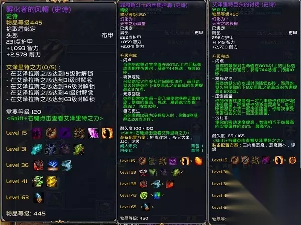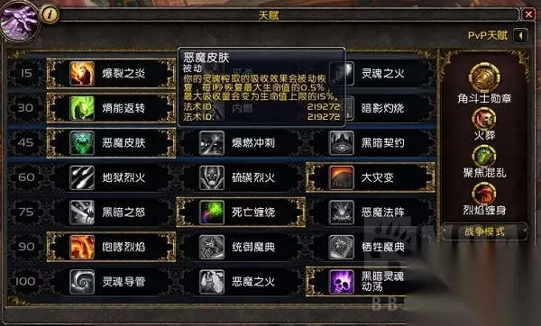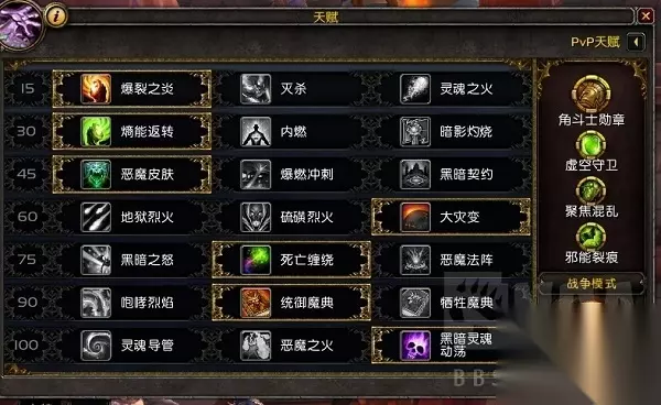 精华天赋 个人觉得头最好是灵魂供能头,闪点加混乱浴火如图,但是我没有,就带了个战场集火,配合神牧的进攻也不错。 关于精华天赋:尝试过很多,主完美拼脸,主清醒秒人,但是不太适合我,因为我主完美他不触发,主清醒秒不了人,高层混乱老被断要不就被龟,尝试过骗反,没啥卵用。 所以有一天一直换精华加上熬夜打,状态不是很好,从2566被打回了2488,吃我最多的是个奥德,具体我会下面讲。自闭了一天半,然后第三天晚上跟血走讨论了一下,取了取经还是决定用平伤流。所谓平伤就是,不点地狱火增伤。 精华不带完美愿景,主冲突,副熔炉加生命凝力,天赋不出地狱火增伤出咆哮烈焰,荣誉带聚焦混乱,定身,火葬,内战我有时候会把火葬换成虚空守卫,有时候就不会,打DK把定身换成致死。别的不管什么组合天赋精华一律不变。如果有打喜欢打爆发流的天赋特质个人认为最好的如图。 平伤流