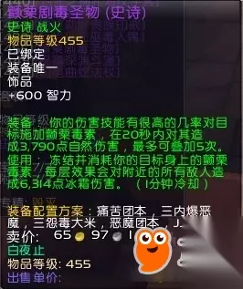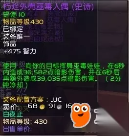 [朽烂外壳巫毒人偶]也是神器,用过都说好,前提是你会用,不然被秒驱,就没啥用了。这俩饰品如何用,对面半血,你反到对面奶了,就直接用,有娃娃就娃娃,没有就5层的毒物爆一下, 对面可能就没了,毒物是不怕驱散的,因为触发极高,驱散了照样叠。